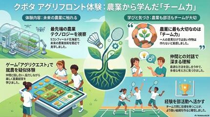 11月9日(日)にKUBOTA AGRI FRONTで開催されたアグリウィークに参加しました。参加してみて、農業と経済の関係性やじゃがいも、牛乳への知識を蓄えることができました。また、農業の問題点や課題などたくさんの現状を知ることができました。今回イベントに参加して得ることのできた知識や経験を学校生活やバトミントンに活かしていきたいです。 部員