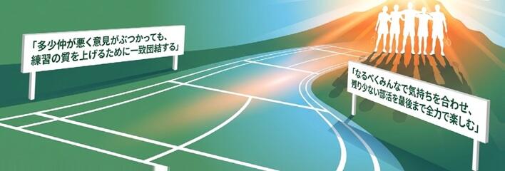 今回のミーティングを通して、目標を立てることの大切さを改めて感じました。長期的な目標も大事ですが、短期的な目標ではより達成感を得ることができ、ゴールの遠い目標よりも努力が続けやすくなると感じました。去年よりも学習面の意識が高くなり勉強と部活の気持ちの切り替えの難しさをより実感しています。勉強、部活両方で短期目標がある事が、モチベーションの維持や気持ちの部分の支えになってくれると思います。